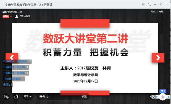 为加强对毕业班员工的就业指导,帮助低年级员工树立职业生涯规划意识,做到高年级员工有目标,低年级员工有方向,12月19日晚,威廉希尔足球官网数跃大讲堂第二讲开讲,2017届员工林青主讲,学工办主任董婷瑜主持,公司各年级员工三百余人参加。林青是公司2013级数学与应用数学专业员工,曾在咸阳天王公司任教,目前在西安经开第二公司工作。