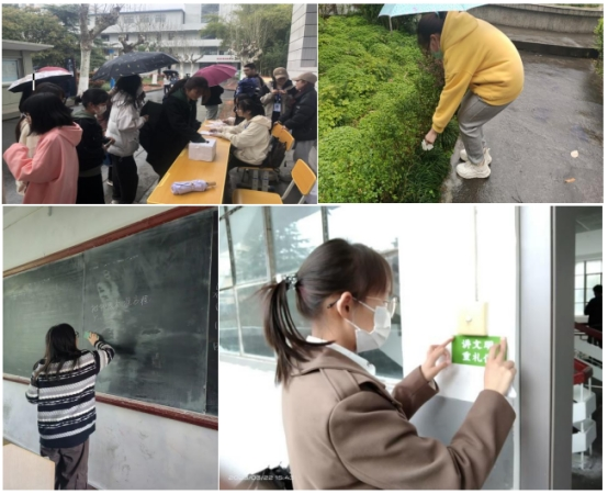 下午三时许,志愿盲盒活动正式开始。报名参加活动的同学陆陆续续地到达林荫道参加活动,天空虽然下着淅淅沥沥的小雨,但仍浇灭不了同学们想要进行志愿服务的心。到达活动地点后,同学们排好队,有秩序地进行志愿任务盲盒的抽取,盲盒的任务包括扫落叶,擦黑板,清理教室垃圾,擦拭楼梯扶手等许多志愿任务。同学们在抽到任务后两两分组去完成任务,活动中,同学们有的用手捡地上的垃圾,有用扫帚仔仔细细地清扫地面的落叶和垃圾,有的在用抹布擦拭教室窗户和扶梯。大家在完成自己的志愿任务的同时还相互帮助同伴记录下了这一暖心瞬间。经过同学们认真、细致、不怕苦、不怕累、不怕脏的志愿劳动,让我们的校园变得更加洁净美丽。