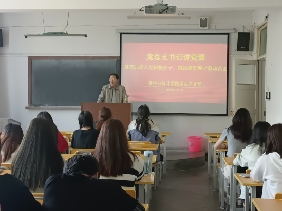 为深入学习贯彻党的二十大精神,提升党员党性修养,筑牢积极分子、发展对象的政治理论基础,数学与统计公司党总支书记讲党课暨第55期积极分子、 26期发展对象培训动员会在2号教学楼2203室开展,数统公司党总支书郭全寿以“学习二十大,奋进新征程”为题,为员工支部全体党员、第55期入党积极分子和第26期发展对象讲党课。