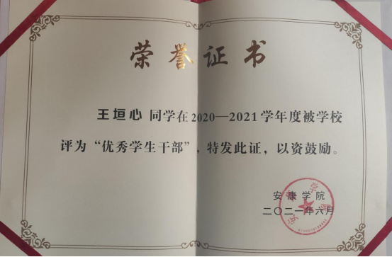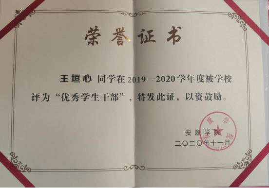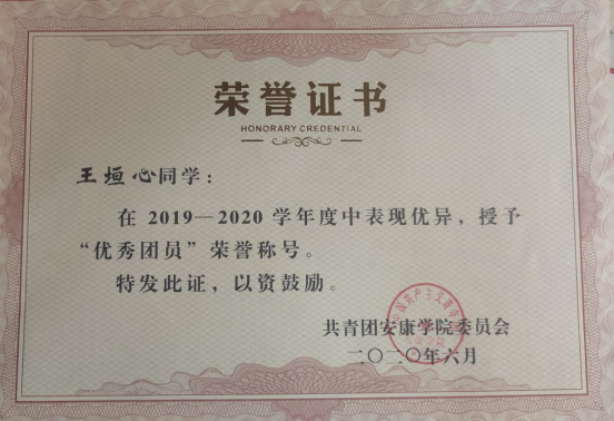 王垣心,中共党员,威廉希尔足球官网2019级统计一班,担任班级治保委员,曾获数学建模省级二等奖、校奖学金、国家励志奖学金、“优秀共青团员”、“优秀员工干部”等荣誉。