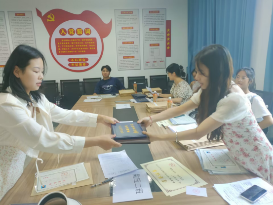 6月27日毕业班辅导员刘佩召开了离校教育会议,对毕业生就离校程序、领取材料、如何委托代领等进行了详细指导。6月28日,员工支部书记董婷瑜、毕业班辅导员刘佩和马勇召集党团先锋队成员就毕业生离校工作进行分工和安排,志愿者分为信息组、领取组、后勤组,要求工作人员细心、耐心、热心,分工合作,按照程序开展各项工作。随后,后勤组对毕业生的各项材料进行了分班、分类整理,确保最大限度节省毕业生领取材料的时间。