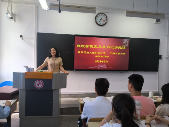 为不断提升党员党性修养,做好入党积极分子、发展对象的培养教育工作,5月17日,数学与统计公司党总支书记讲党课暨第57期积极分子、28期发展对象培训动员会在江南校区1202室开展,公司党总支书记储玖琳主讲,公司2024年春季党校培训班学员、员工党员参加了学习。