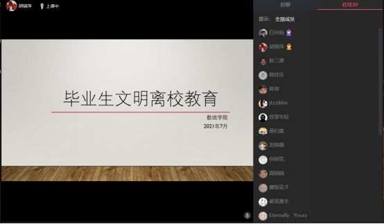 6月30日,毕业班辅导员董婷瑜、刘佩召集在校班委传达了公司关于离校教育的相关通知精神,对离校手续办理、毕业相关材料的领取进行了详细的解释,接着从往返安全、文明离校、加强自我约束、诚信感恩、疫情防控等各方面对毕业班提出要求。7月1日-4日,毕业班各班召开线上班会,班委带领员工认真学习了《关于做好2021届毕业生文明离校教育工作的通知》,要求大家文明离校,号召同学们心怀感恩,展现公司员工良好的精神面貌。