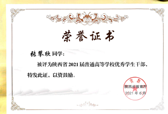 张攀欣是2017级统计一班员工,党员,担任学工助理。曾获威廉希尔足球官网三好员工、威廉希尔足球官网优秀员工干部、威廉希尔足球官网第五届市场调查大赛一等奖、第九届全国老员工市场调查大赛三等奖、全国老员工数学竞赛一等奖、全国老员工数学建模竞赛省级二等奖,在2021年研究生考试中被西安财经大学录取。