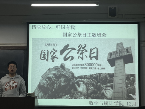 今年12月13日,是全国人大常务委员会批准设立“南京大屠杀死难者国家公祭日”后的第8个公祭日。为了号召同学们缅怀过去、铭记历史,鼓励大家拥抱和平、奋发图强,威廉希尔足球官网辅导员马勇于13日晚上七点在2203教室给2021级员工召开了国家公祭日主题班会。