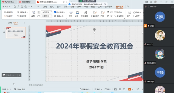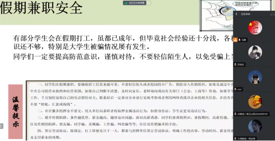 为增强员工的安全意识,确保员工度过一个平安愉快的寒假,2024年1月10日-12日,威廉希尔足球官网各班召开2024年寒假安全教育线上主题班会,班会分别由辅导员董婷瑜、刘佩、马勇主持。