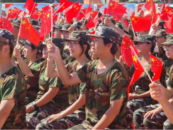 活动现场,人声鼎沸,气氛热烈。数统学子们身着统一的迷彩服,以连队为单位整齐列队。“团结就是力量,团结就是力量”伴着激昂的旋律同学们挥动着手上的国旗,一段段铿锵有力的歌声展现出数统学子们的强国志和爱国情。