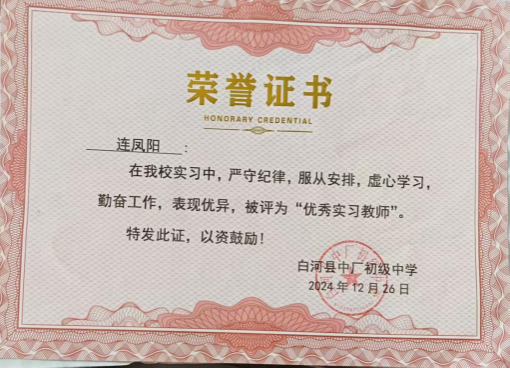 “教育的意义,在于传递知识与希望。”带着这份信念,连凤阳在白河县中厂初中实习期间全身心投入教学。他主动向实习单位教师请教备课技巧,结合山区员工特点设计教案,多次利用课余时间为留守儿童辅导功课,被评为“优秀实习教师”。这段经历让他更坚定了扎根基层教育的决心:“教师不仅是职业,更是点亮员工未来的引路人。”