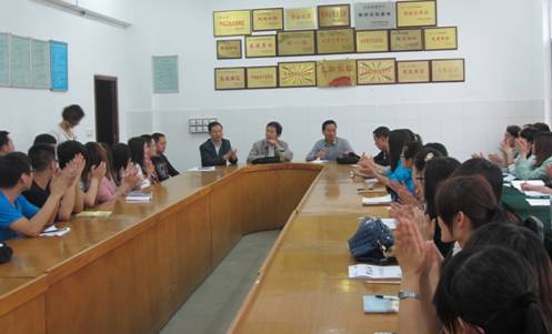 二、讨论交流:课后,授课老师与见习员工在迎风九年制公司会议室进行了座谈交流。座谈会由李善明老师主持,首先由授课老师们就所上课的课型、教学重难点、员工状况、教学目标、教学过程安排等问题作介绍,然后就备课,上课,课堂组织管理,课堂交流等同学们关心的问题进行了交流。交流会气氛热烈,问题不断,该校董事长张祥森,教导主任夏发财就中学教师的德、能素质作了阐述,见习员工深受启示。最后郭全寿、汪义瑞代表数学与统计系对迎风九年制公司为此次教育见习实践活动提供的大力支持表示衷心地感谢。并要求见习员工整理好听课记录,认真总结,虚心求教,为见习试讲、教育实习等实践环节积累经验。