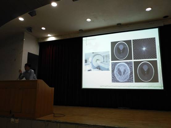 李海洋教授从自己的研究内容开始,主要介绍了压缩感知理论的理论背景和相关前沿问题,并以CT为例,系统阐述了压缩感知理论及其应用。报告会内容精彩,得到了在场师生的阵阵掌声。