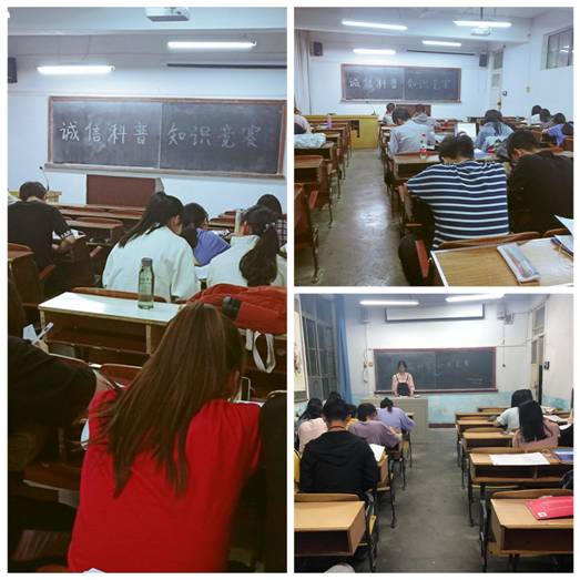本次竞赛采取书面考试形式,本院团总支成员负责监考。参加考试的同学,准备充分,答题认真,无违规作弊行为;负责监考的同学,认真负责,一丝不苟。所有工作都有条不紊的进行。历时一个小时的诚信知识竞赛考试圆满结束。