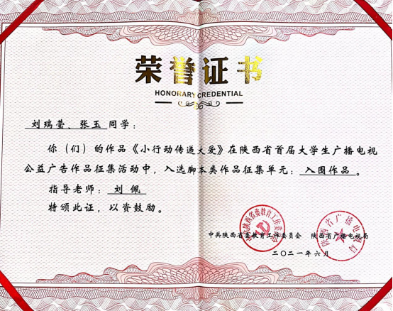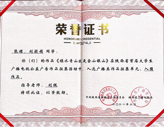 该项活动由中共陕西省文明办指导,中共陕西省委教育工作委员会和陕西省广播电视局联合主办,陕西省广播电视对外交流中心、彬州梦想流坊文化传播有限公司承办,以“四史”学习、全面建成小康社会、脱贫攻坚、新冠疫情防控、聚焦“十四运”等为主题。活动自发布以来,在陕西省内共收集了30个高校的500余件作品,其中我院员工张蝶、刘颖娟创作的广播作品《绿水青山就是金山银山》,刘瑞莹、张玉创作的脚本作品《小行动传递大爱》均入围优秀作品,指导教师刘佩被评为“优秀指导老师”。