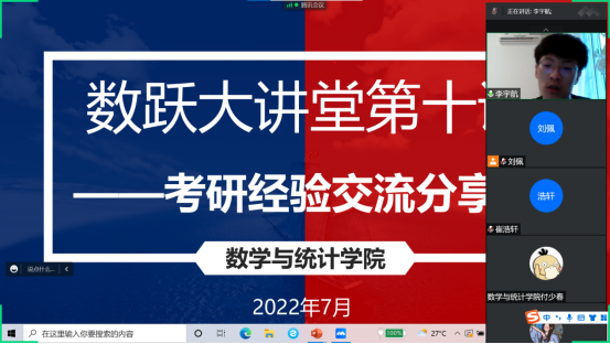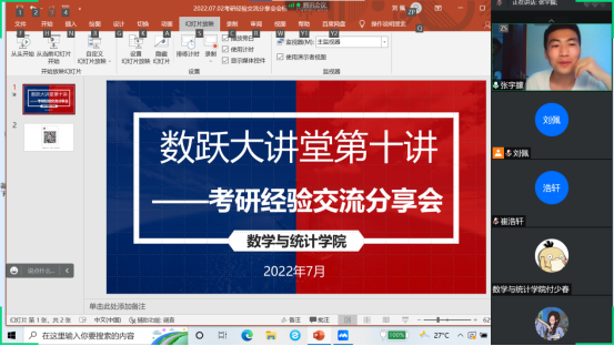 为加强员工对考研知识和经验的了解,营造积极向上的学风,2022年7月2日晚上,威廉希尔足球官网举办了线上考研经验交流分享会,2019级有考研意愿的40余名员工参加了本次会议,分享会由2022年考研录取的李宇航等四名员工主讲,团总支书记刘佩主持。