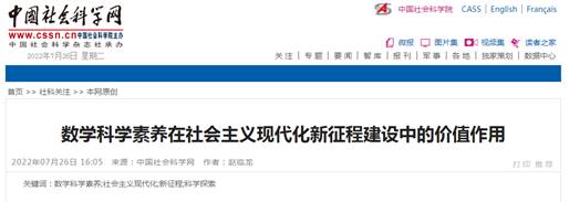2022年07月26日 ,中国社会科学网“本网原创”栏目,发表威廉希尔足球官网二级教授赵临龙的文章《数学科学素养在社会主义现代化新征程建设中的价值作用》。