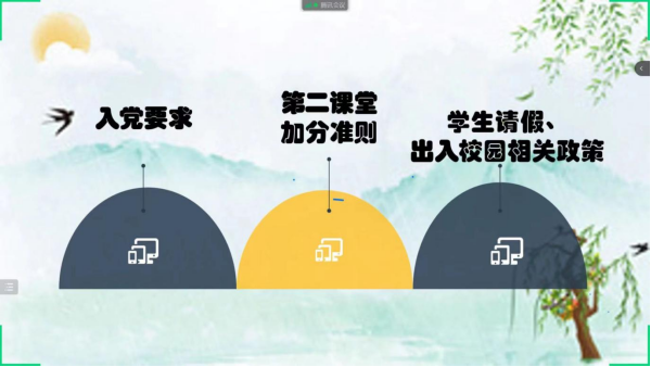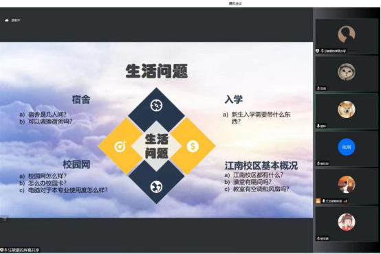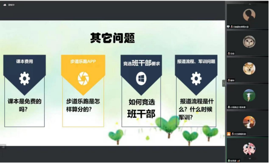 随后,团总支员工干部黄佳怡讲解了团关系转接流程、国家奖学金获得者杨浩源对如何安排大学一年级学习介绍了自己的经验、员工会干部张思源、董帅等人分别介绍了参选班干部、乐跑步道、宿舍分配、校园环境等新生关心的其他问题。
