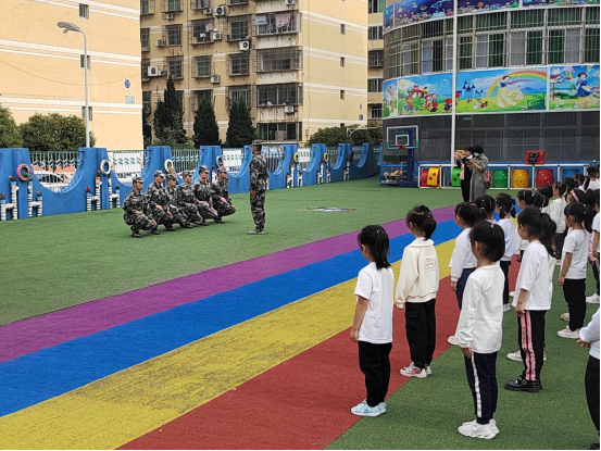 9月26日下午集合完毕后,李阿迪同公司其他退伍士兵跑步进入长兴幼儿园操场中央。队列班首先整理了着装,之后依次进行了立正、稍息、跨立、停止间转法、敬礼、礼毕、蹲下、起立的展示。最后进行的是基本步法,齐步、正步、跑步,从行进到立定,无不展现出训练有素的军人气质和精神。展示过程中,小朋友们掌声不断,深深被队列整齐、有力的动作所吸引。在幼儿园小朋友们热烈的掌声中,他们跑步离开训练场。