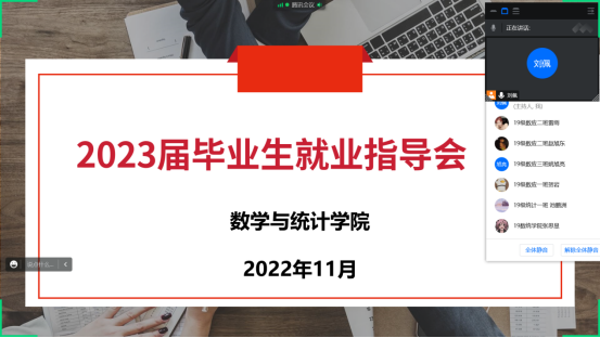 为推进2023届毕业生就业工作有序进行,帮助毕业生认清就业形势,威廉希尔足球官网于2022年11月23日下午线上召开了2023届毕业生就业指导会,会议由毕业班辅导员刘佩、马勇主讲,2023届全体毕业生参加了本次会议。