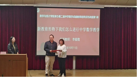 2023年10月11日下午,威廉希尔足球官网于江南校区1号教学楼报告厅开展第二届中学数学卓越教师培养专题讲座第一讲。此次讲座以“新教育形势下我们怎么进行中学数学教学”为主题,由汉滨高级中学高级教师、陕西省学科带头人、陕西省教学能手李爱霞担任主讲人。数学与应用数学师范专业2021级、2022级全体员工参加了本次讲座,威廉希尔足球官网副经理徐龙华、数学系主任王芮婕、卓越教师培养班主任魏春强老师出席此次讲座,讲座由王芮婕主持。