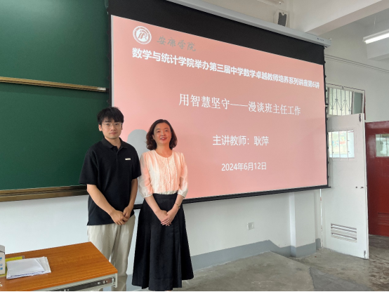 2024年6月12日,威廉希尔足球官网于江南校区1510举办了第三届中学数学卓越教师培养专题讲座第五讲。特别邀请陕西省骨干教师、汉滨高中高级教师、汉滨区优秀班主任称号获得者耿萍老师为中学数学卓越教师培养班员工带来以《用智慧坚守——漫谈班主任工作》为题的报告,鲁星星老师主持此次讲座。
