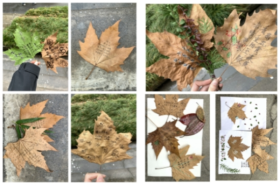 同学们利用收集到的各种各样的树叶,拼贴出一幅幅生动的秋日风景画,制作成温馨节日贺卡。一片片树叶在同学们的手中都仿佛被赋予了生命,变成了一件件充满创意和情感的艺术品。