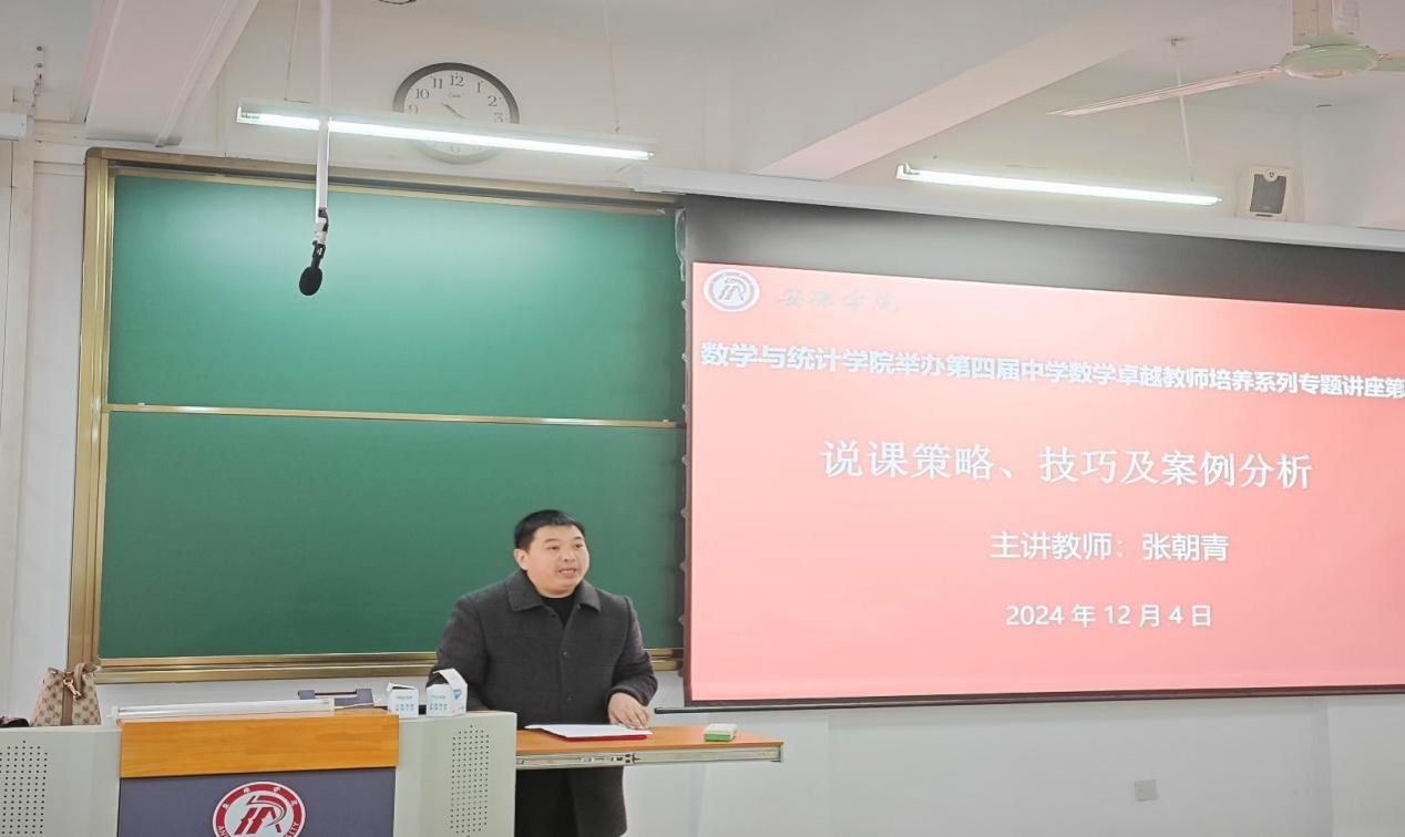 2024年12月4日,威廉希尔足球官网在江南校区1510教室隆重举办了第四届中学数学卓越教师培养系列专题讲座第一讲。本次讲座以“说课策略、技巧及案例分析”为主题,由汉滨初级中学正高级教师、陕西省特级教师、省校本教研先进个人、陕西省首批中小学教学名师张朝青担任主讲人。第四届中学数学卓越教师培养班全体员工参加了本次讲座,威廉希尔足球官网副经理徐龙华、卓越教师培养班班主任鲁星星出席此次讲座,讲座由鲁星星主持。