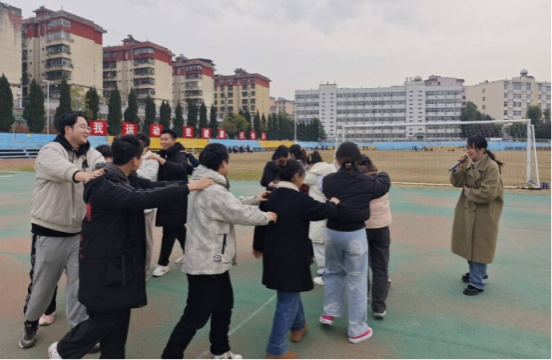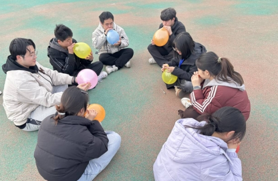 活动第二环节为“聚力前行”。活动特别安排集体前往操场,邀请心理健康中心教师唐明宇指导开展团体解压活动。通过“压力气球”“互助按摩”等趣味游戏,大家在协作与欢笑中有效释放了焦虑、凝聚了斗志。阳光下舒展的笑脸,展现出一派积极阳光、团结向上的氛围。